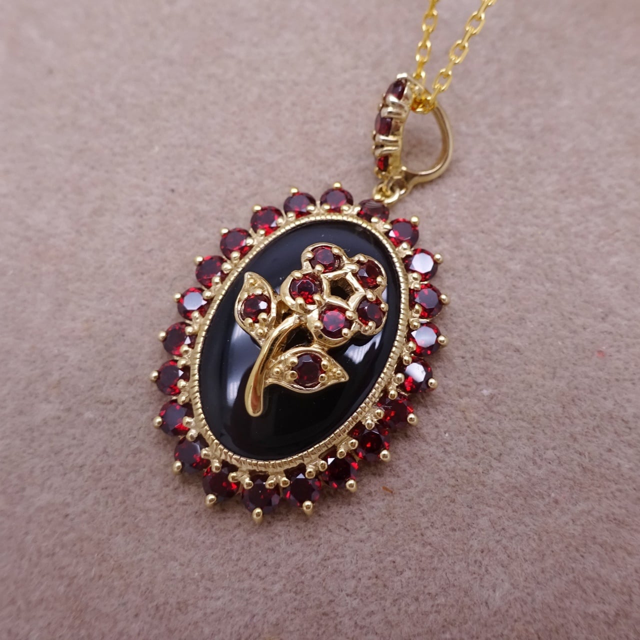 中央の黒のオニキスの上に、ガーネットで小花がデザインされています。 周りを綺麗なガーネットが取り巻いてシックで華やかな素敵なペンダントです。 (チェーンは付いておりません) 縦3.3cm 横2.0cm(バチカン含む) ガーネット、オニキス、シルバー台にゴールド加工