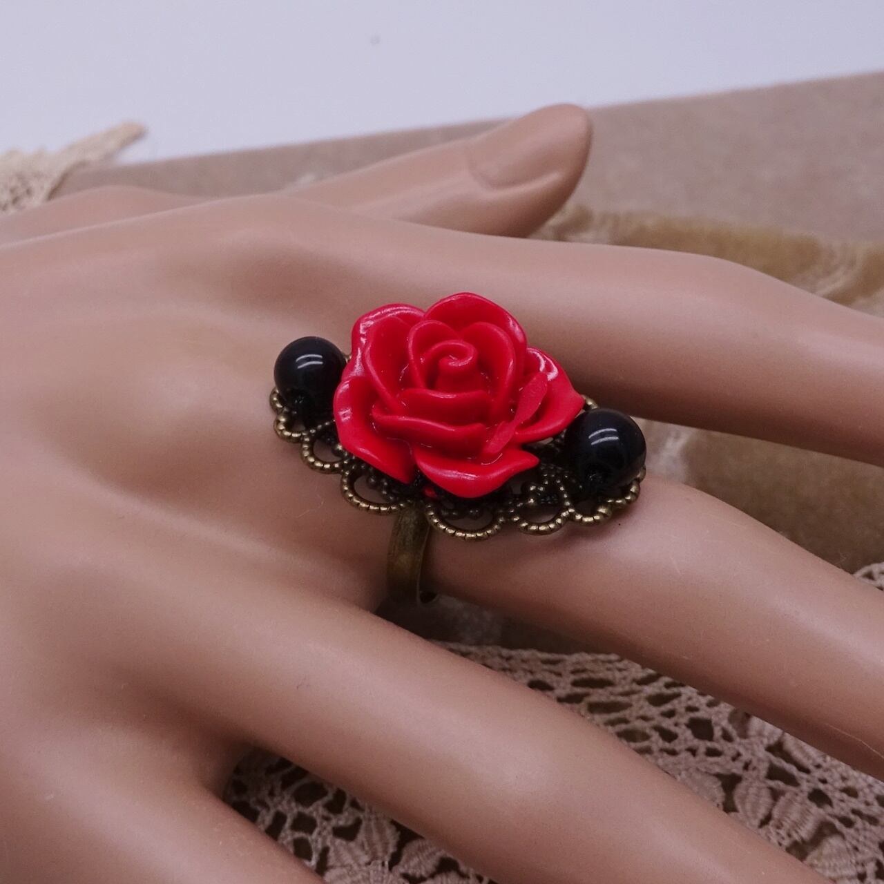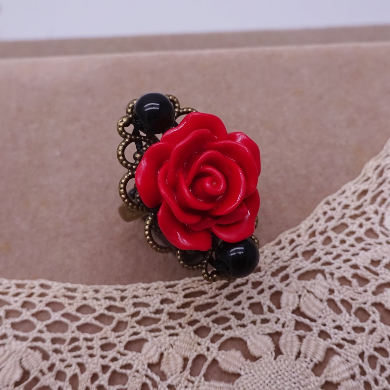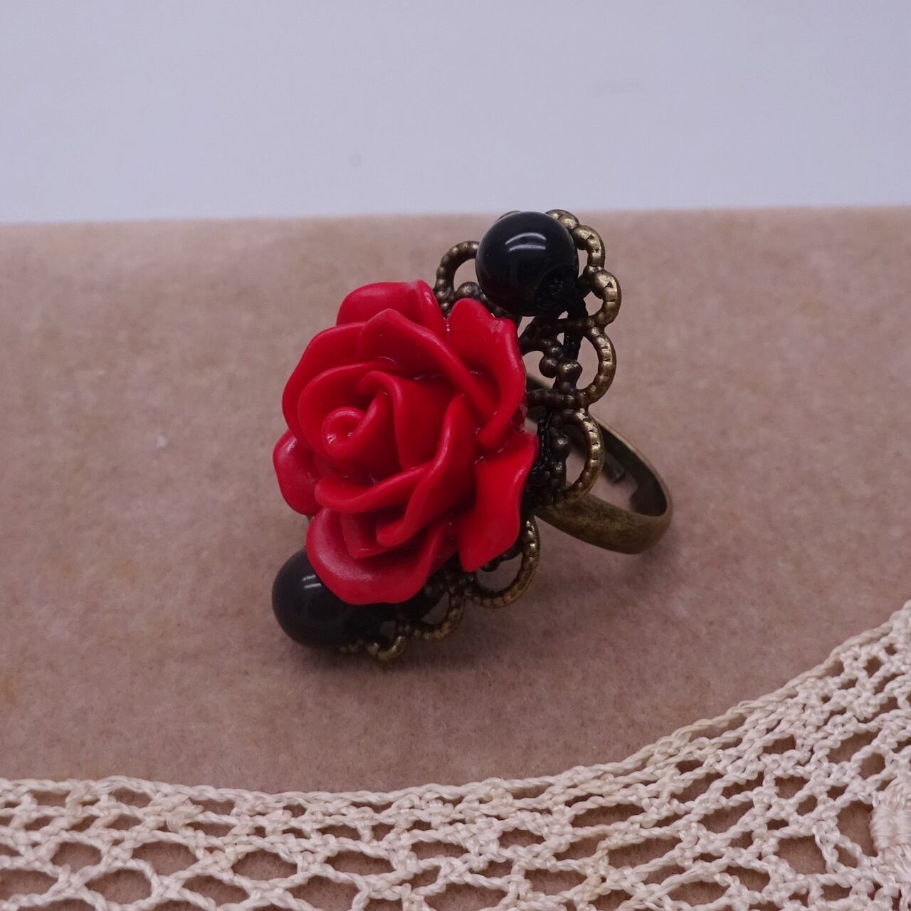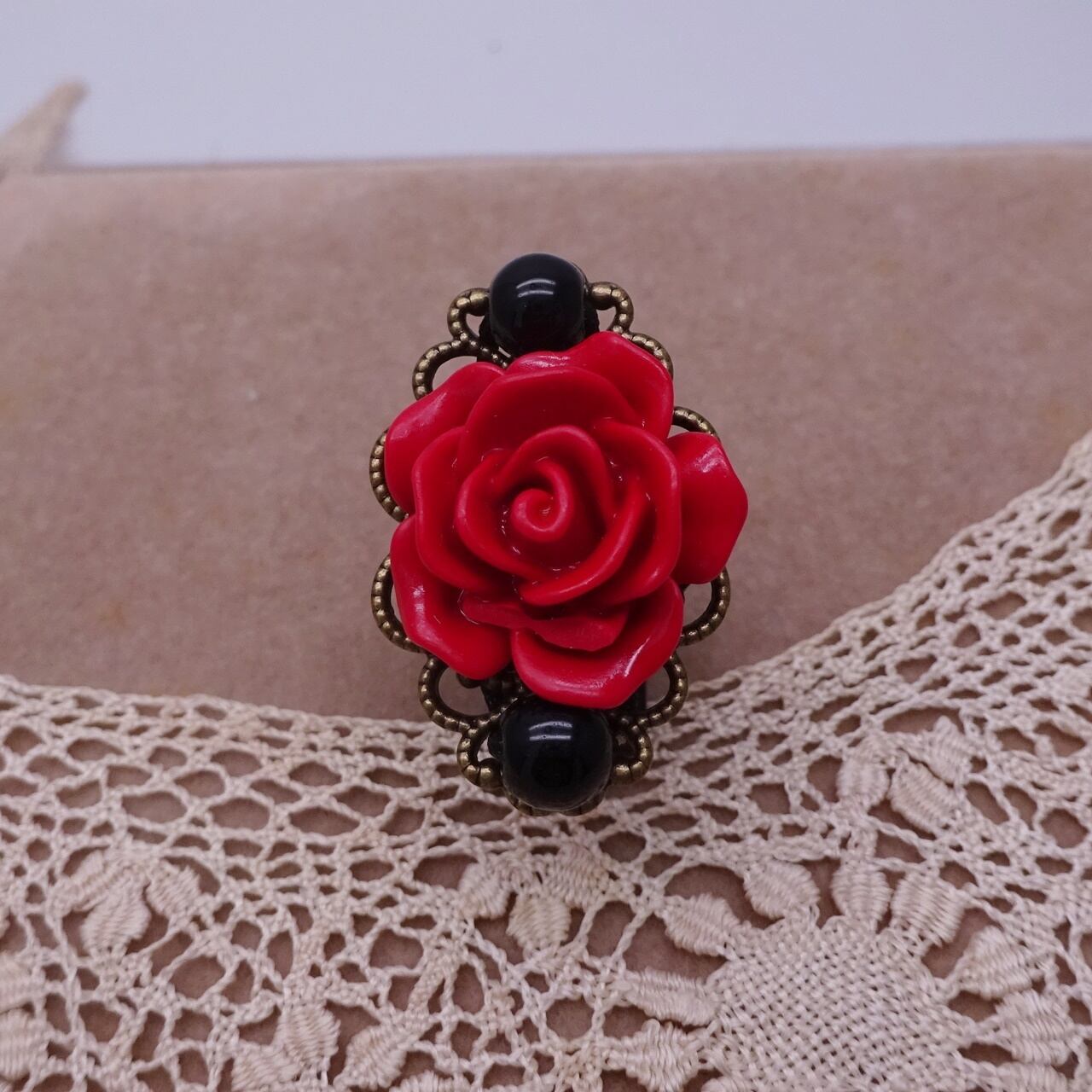 アンティーク・ゴールド色の上に、赤いバラと黒のビーズを使用したお洒落なリングです。 縦3.0cm 横1.8cm 合成樹脂、合金